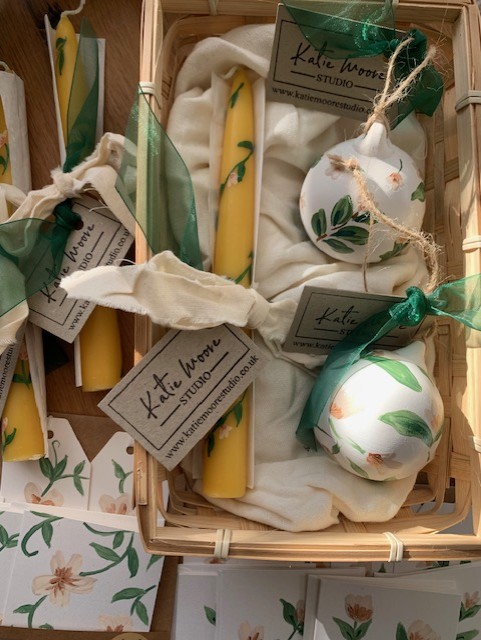Please get in contact if you wish to create a beautifully curated basket for someone special – fill with items crafted with care, items include hand painted baubles and candles, gift and tag card sets and more. Prices subject to items selected.
