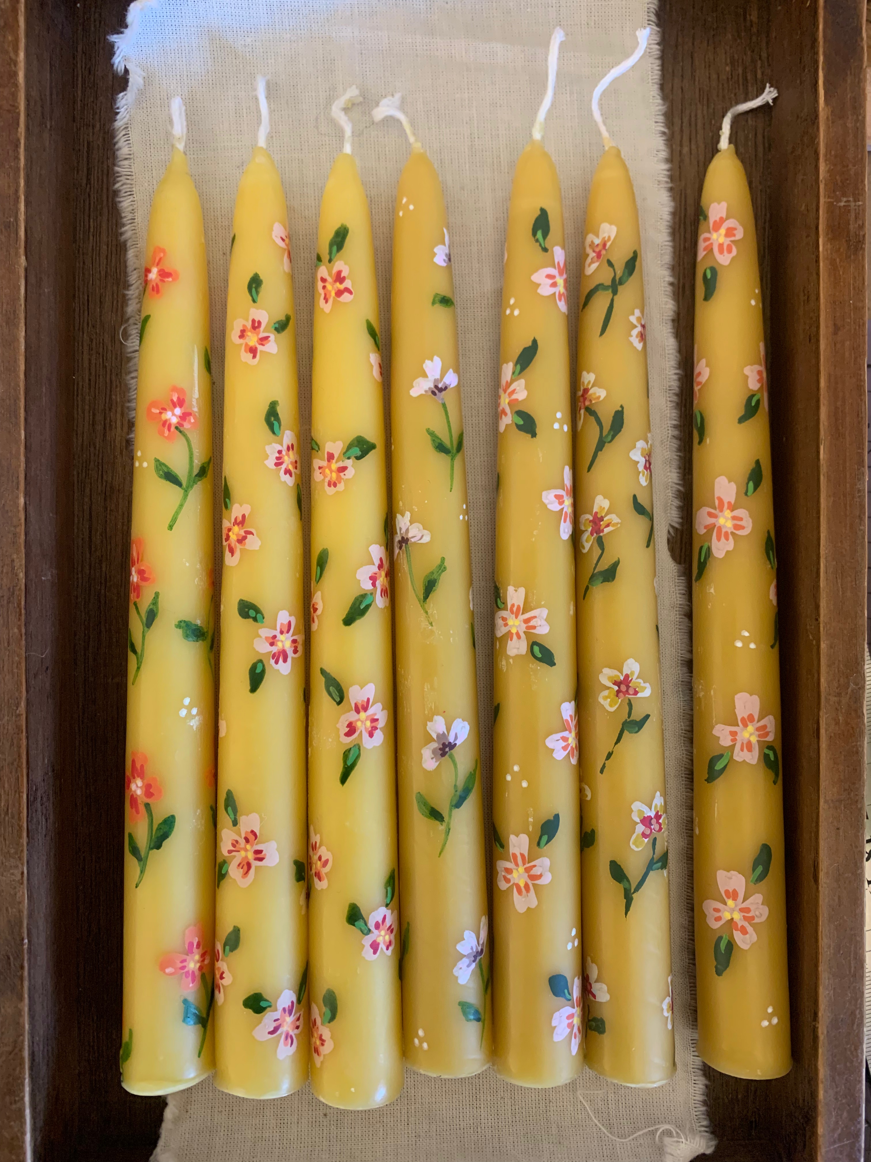 These premium handmade 100% beeswax taper candles are crafted from minimally processed 100% pure Dorset beeswax, sourced from a like-minded small business that shares my values. Each candle is lovingly hand-painted by me using non-toxic acrylics, featuring delicate floral illustrations that add a touch of elegance to any space. Measuring 20 cm in length with a 2 cm diameter, they feature a natural cotton wick and offer a clean smoke-free burn time of over 7 hours.