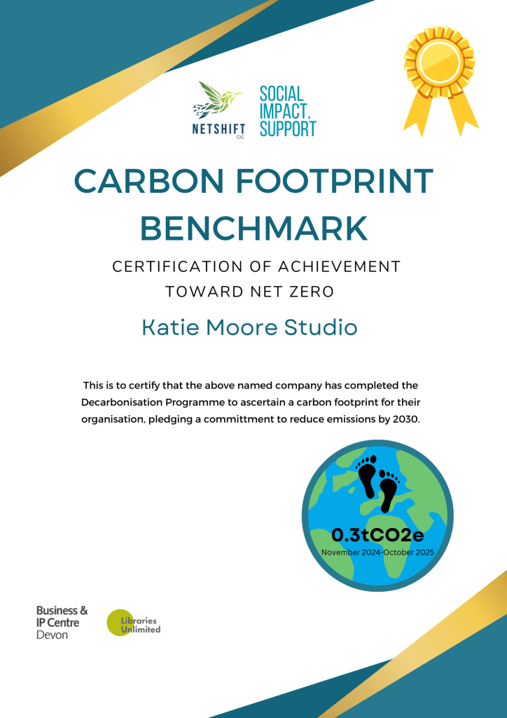 I recently completed the Decarbonisation Programme with Netshift / Social Impact Support to calculate the carbon footprint of Katie Moore Studio, and was provided with a Carbon Reduction Plan & SME Recommendation Report.